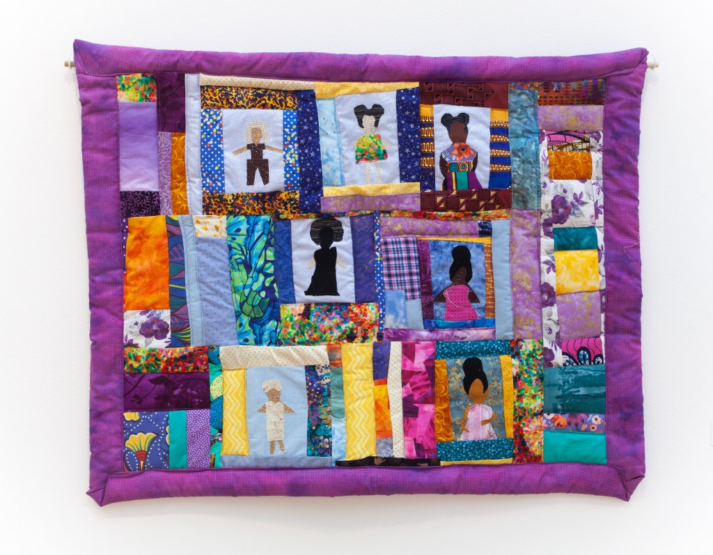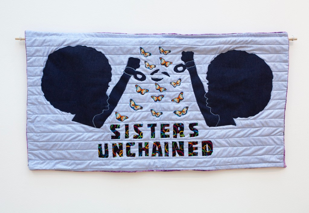 These quilts were made by Kimberly Love Radcliffe during a summer program with Sisters Unchained, an organization centering the daughters of (formerly) incarcerated persons. One of the quilts are silhouettes that represent those individuals who have helped the young women heal; the other quilt is the logo of the organization, created as a gift by the artist.
